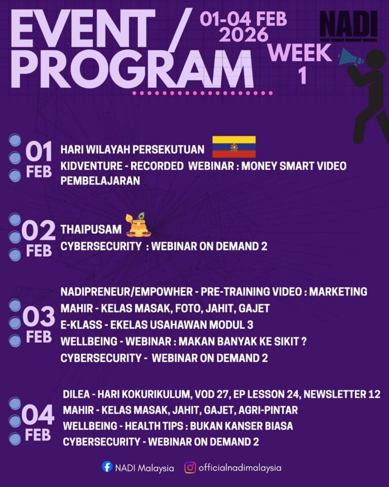 π’ JOM SERTAI EVENT / PROGRAM NADI β WEEK 1π 01 β 04 Februari 2026 Pelbagai program bermanfaat, santai & berilmu menanti anda sepanjang minggu ini! πSesuai untuk pelajar, ibu bapa, usahawan & komuniti setempat.