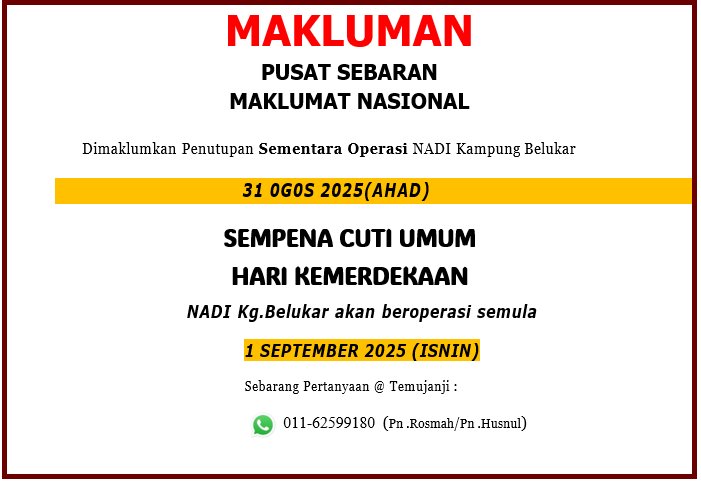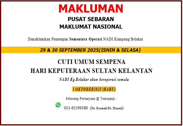 📢 MAKLUMAN PENTING 📢 Dimaklumkan bahawa NADI Kampung Belukar akan ditutup sementara pada 29 & 30 September 2025 (Isnin & Selasa) sempena Cuti Umum Hari Keputeraan Sultan Kelantan. 🗓️ Operasi NADI Kg. Belukar akan bermula semula seperti biasa pada:👉 1 […]