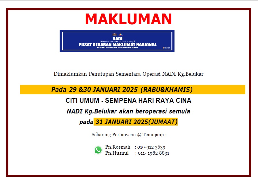 🗓 Tarikh: Khamis, 23 Januari 2025⏰ Masa: 2.00 pm – 3.30 pm📍 Lokasi : NADI KAMPUNG BELUKAR